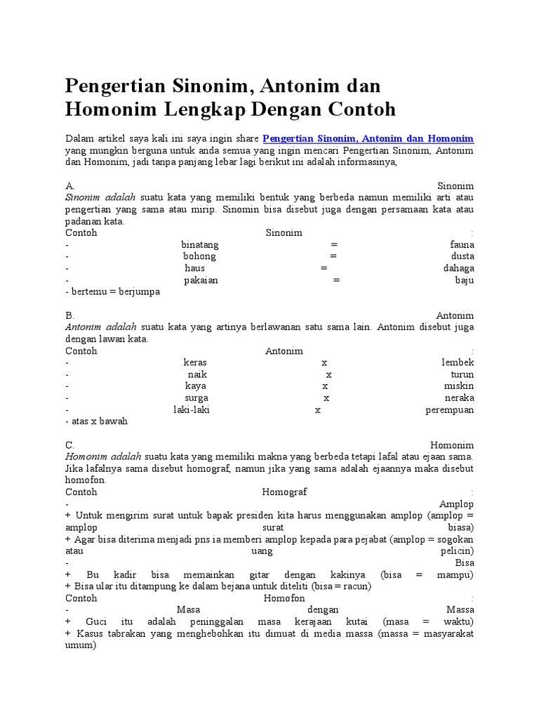 Definisi sinonim adalah secara etimologi kata sinonim berasal dari bahasa yunani kuno yaitu onoma yang berarti 'nama' dan syn yang orang tua = ayah bunda, ibu bapak, penanggung, pengampu, wali;