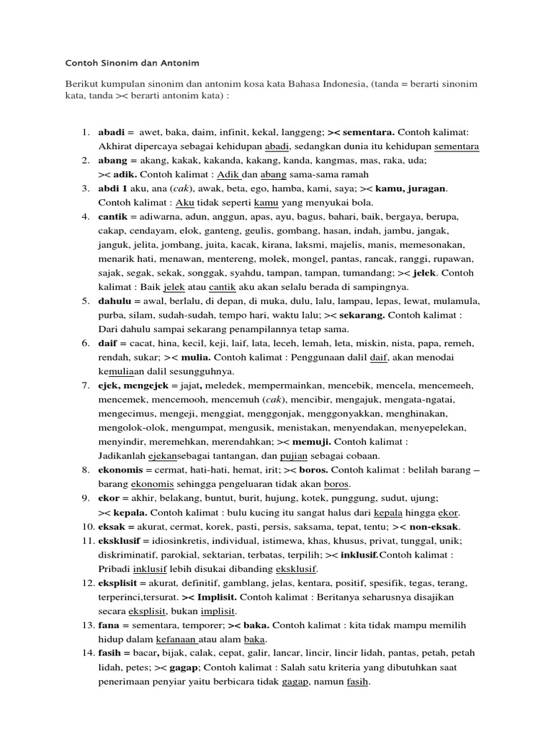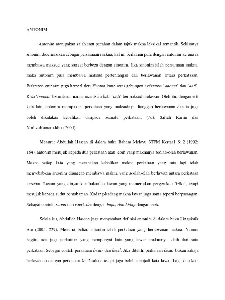 antonim makna antonim di kbbi adalah: Seni merupakan keindahan dan seni adalah tujuan yang positif, serta menjadikan setiap orang yang meilhat atau mendengarnya merasa bahagia. Syatibi, ibn asyur dan ahmad raisuni merupakan antara tokoh yang membuka ruang kepada penulisan. 27) antonim sering juga disebut dengan istilah oposisi makna, seperti pada uraian berikut ini Kesempurnaan manusia adalah takdir bawaan manusia, yang memerlukan hubungan yang harmonis antara kesadaran diri dan rahmat ilahi.