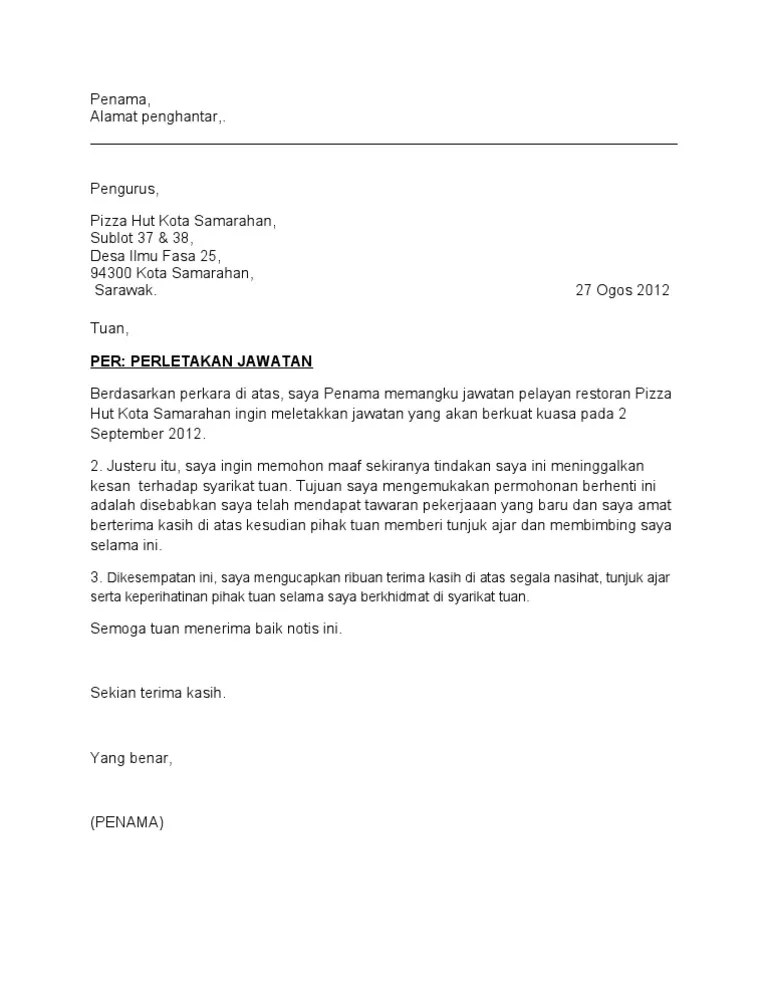 Contoh Surat Rasmi Berhenti Kerja Bahasa Melayu Dan Bahasa Inggeris from www.mysumber.com Contoh surat berhenti kerja notis 30 hari via gambarin.us. Example of resign letter/ contoh surat berhenti kerja via sakuraadibah.blogspot.my. Kami tanya sorang hr (human resource) yang kami. 0 ratings0% found this document useful (0 votes). Notis 24 jam berhenti kerja.docx. Pin contoh surat kiriman rasmi aduan genuardis portal on via www.picstopin.com. Contoh surat berhenti kerja 24 jam seminggu sebulan jawatan kerajaan. Contoh surat pemberhentian kerja dari majikan malaysia.