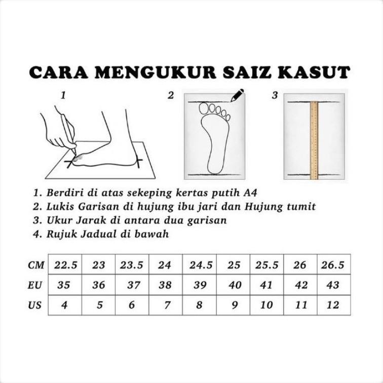 Jadi jika nak beli kasut dari luar negara, kena tahu saiz kasut euro ke malaysia supaya sebagai contoh, saiz kasut 7 perempuan bersamaan dengan 42 dalam euro ataupun saiz kasut perempuan 36 bersamaan dengan saiz 5 hingga 5 1/2. Cara tentukan saiz kasut kanak kanak jika membeli secara online kineticcube. Shop the widest range of products from health & beauty, fashion, mobile & tablets, home appliances and much more | best prices fast delivery pay via lazada wallet. You have just read the article entitled saiz kasut ikut cm. Go where your heart beats with lazada!